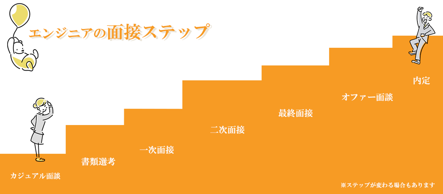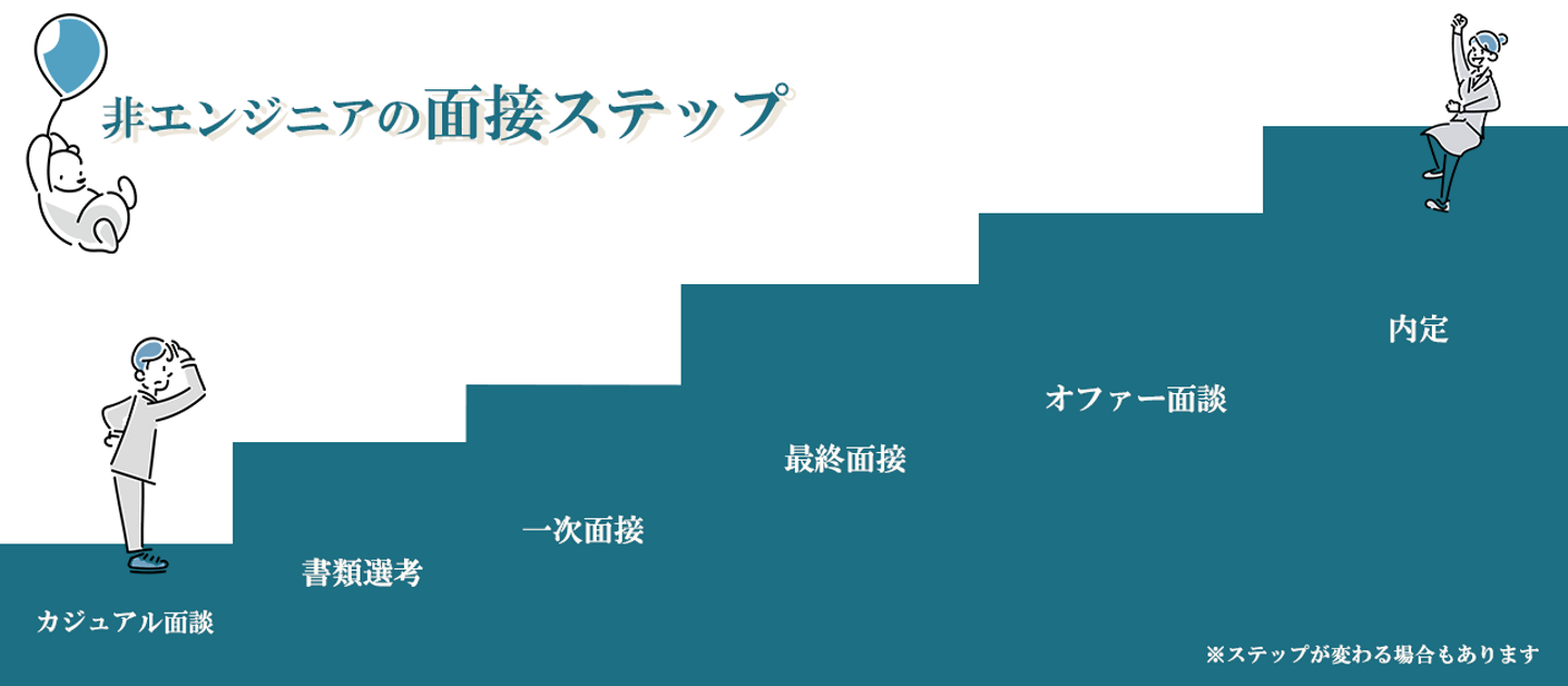 エンジニアの方は、カジュアル面談→書類選考→一次面接→二次面接→最終面接→オファー面談となっています。