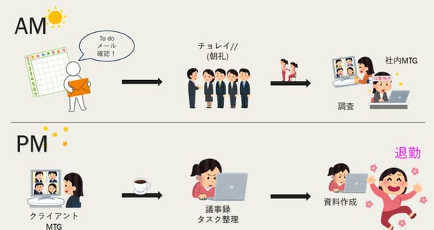 午後はお客様とのミーティングが入ることが多かったので、先輩社員と共にお客様のミーティングに同席させていただいて、そこで議事録を作成するというタスクをもらうこともありました。ミーティング後には、その案件の進捗確認などを行ったりもしますね。他には、午前中に調査したものをまとめて手を動かして資料作成をしたりするのも、午後に行う業務の一つでした。