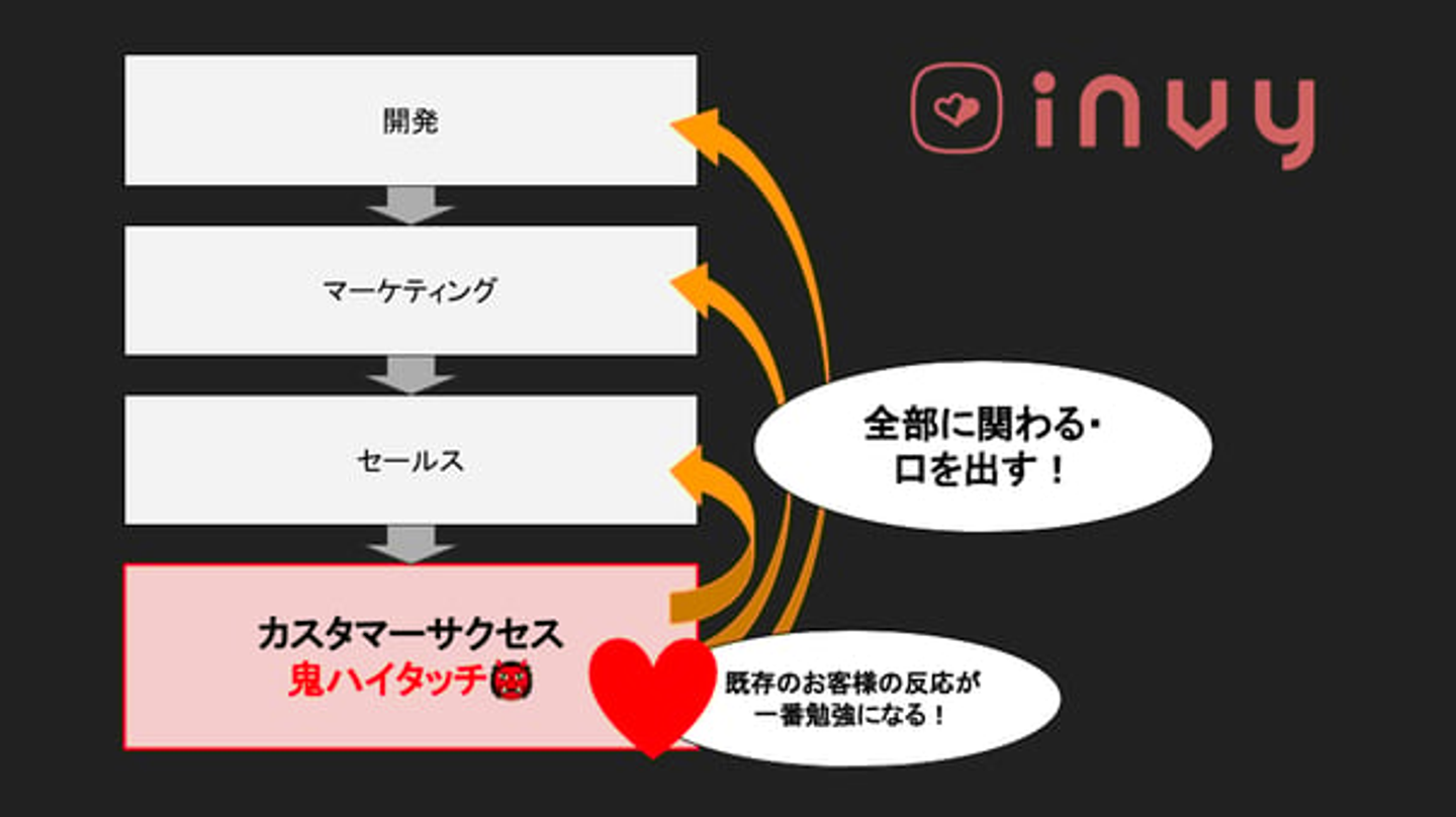 カスタマーサクセスは、既存のお客様を相手にするのですが、invyは比較的新しいサービスで、運用してそんなに年月が経ってないプロダクトなので、何が正解かなんて誰もわからないという状況で仕事をしているということがあります。その中で、正解に近づくための一つのポイントが既存のお客様だと思ってまして。スタイルアップというかそこを汲み取って他に還元していくところがカスタマーサクセスなのかなと思っているので、その意味でお客様にとにかく手を差し伸べて、何が必要かということをよく聴き、それに順次対応しながら、サービスを継続を勝ち取るために日々奮闘しているという感じです。