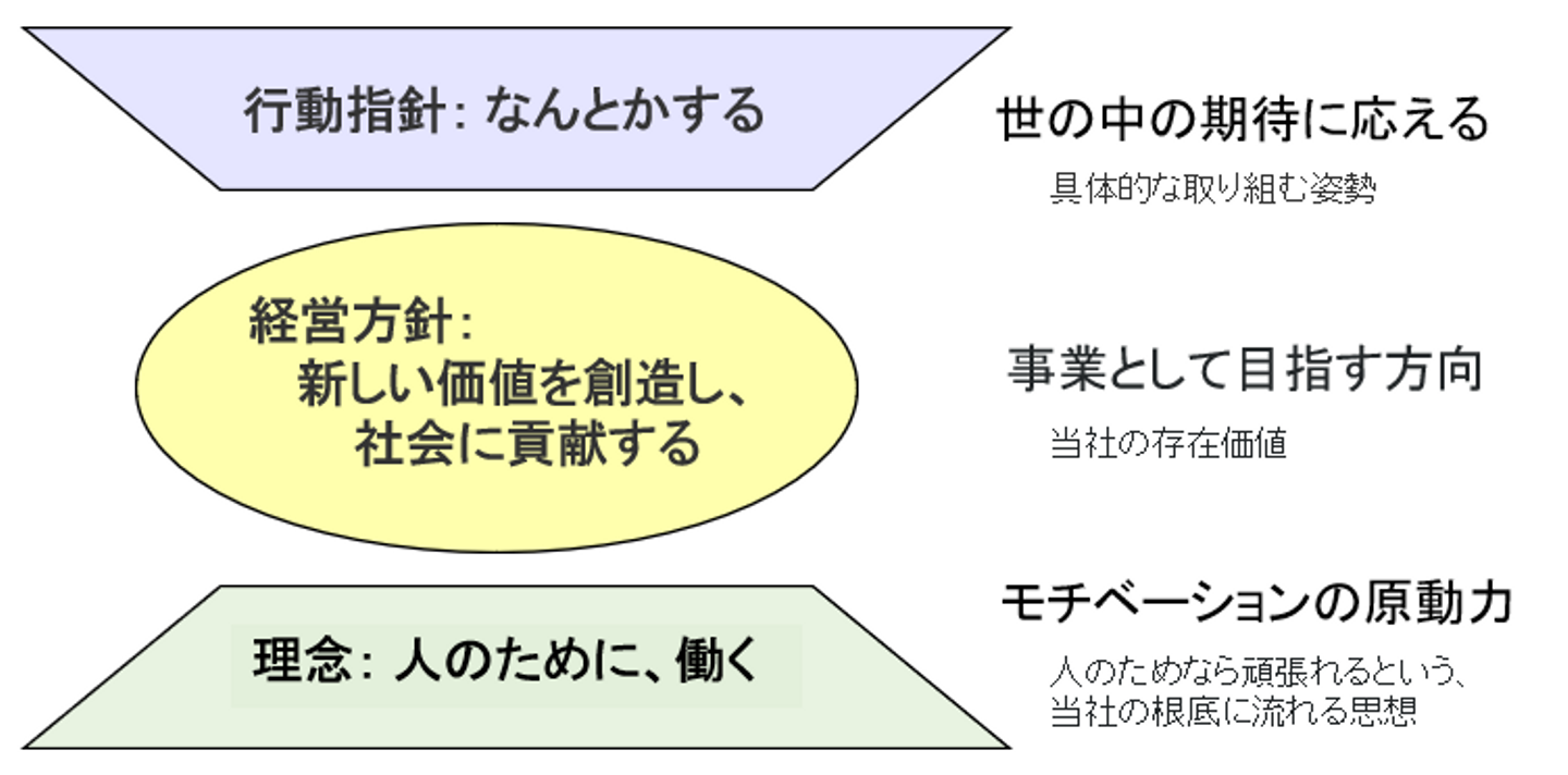当社で掲げている理念、経営方針、行動指針の関係について、下記の図にて説明させて頂きます。