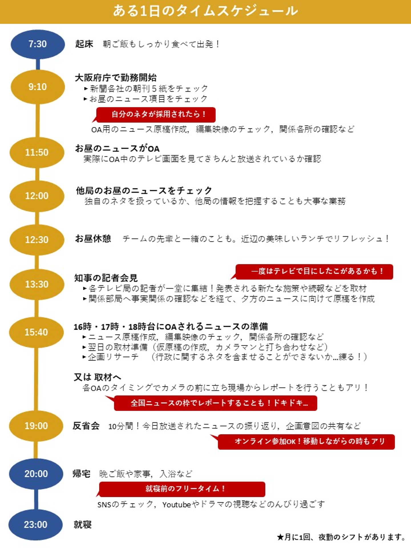 ■現在の仕事内容は? 行政担当の記者として、主に大阪府庁を受け持っています。仕事の流れの一例を挙げると、まず、知事の記者会見を取材するところからスタート。発表された施策などについては、府庁内の関係部局に問い合わせて詳しい情報を集めたり、事実関係の確認などを行います。それらの情報を元に、ニュース番組で放送される原稿を作成します。原稿は上司などのチェックを経て完成し、夕方のニュースで放送されます。時には私もカメラの前に立ち、現場からレポートを行うこともあります。