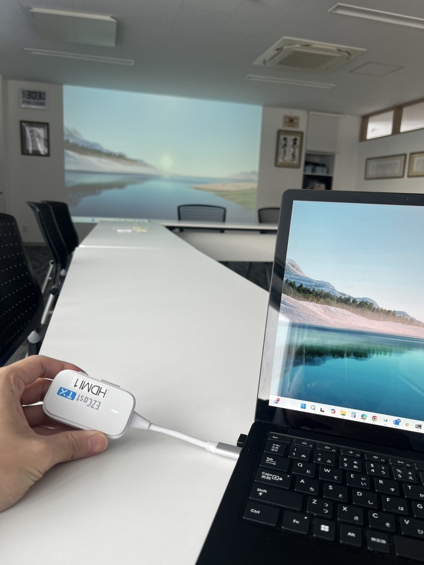 営業会議やプレゼンの場で活躍するのが、プロジェクターへの無線投影。従来のように長いケーブルを回す必要がなく、ノートPCに送信機をつけるだけでスマートに画面共有ができます。