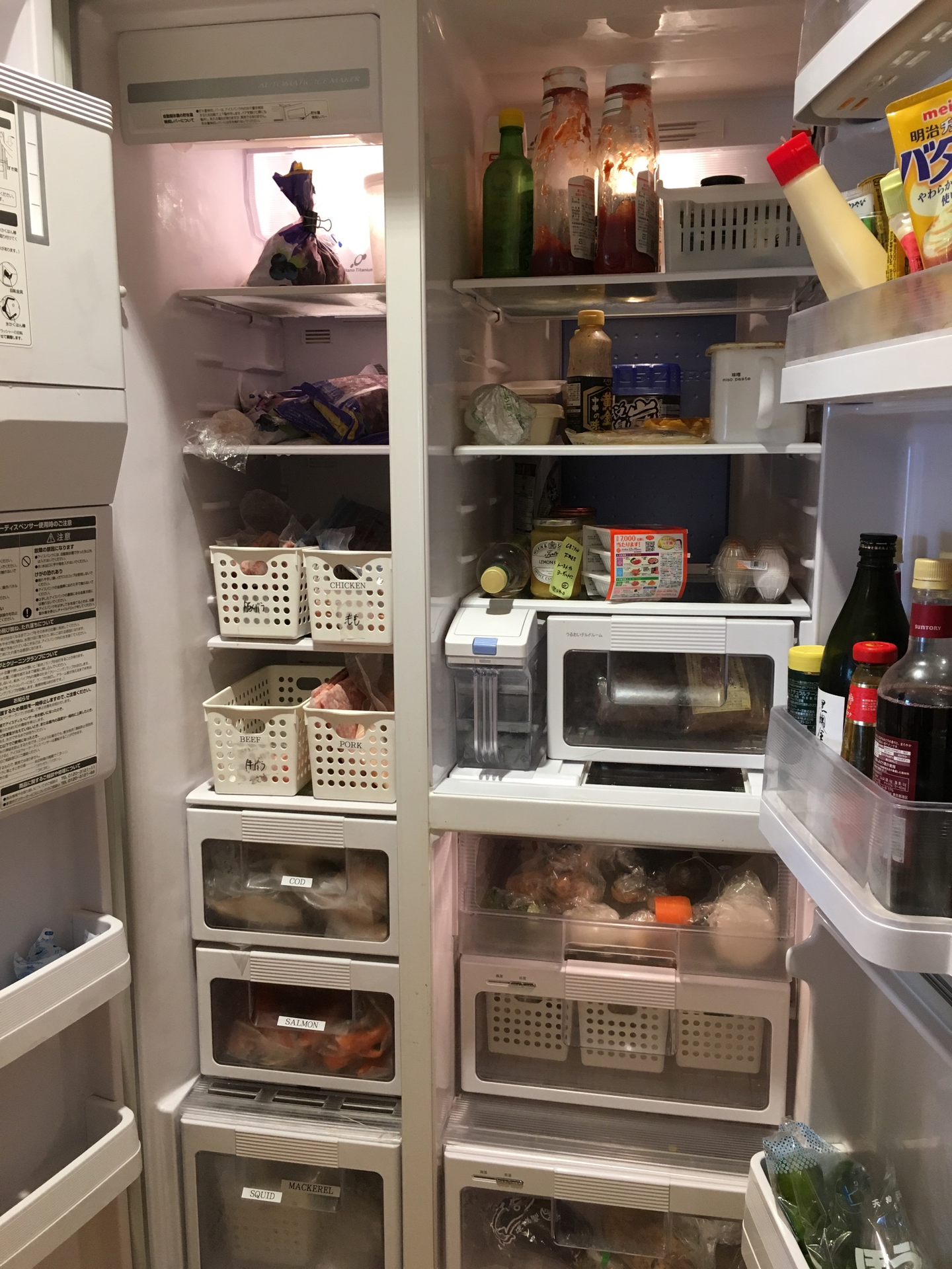 ▲社員さんが自由に料理できる冷蔵後!お肉だけでなく、サーモン用の扉も…!
