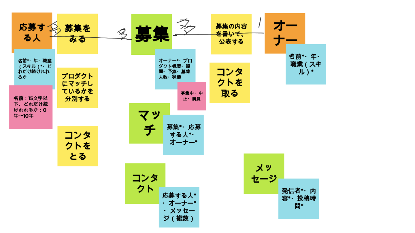 「趣味で作る個人プロダクト」のマッチングサービスを作ると仮定して、設計をしました。少し、内容に触れると