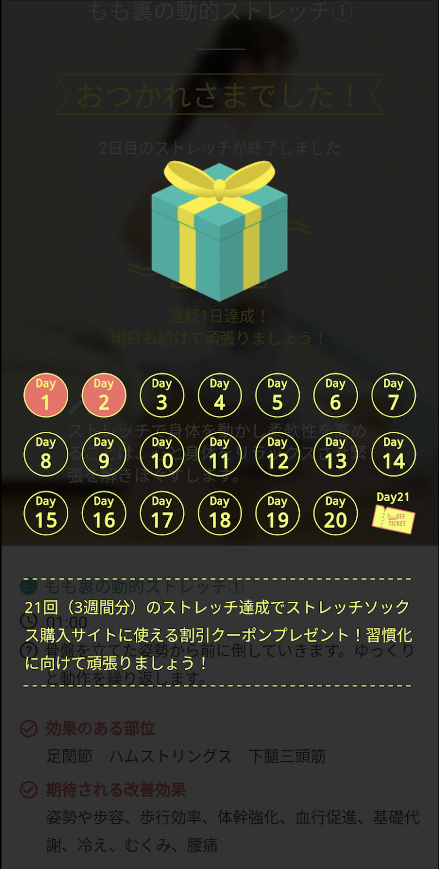 さらに合計21日ストレッチを行うと、ストレッチソックス購入の際に使用することができる割引クーポンをプレゼントという特典もついています。