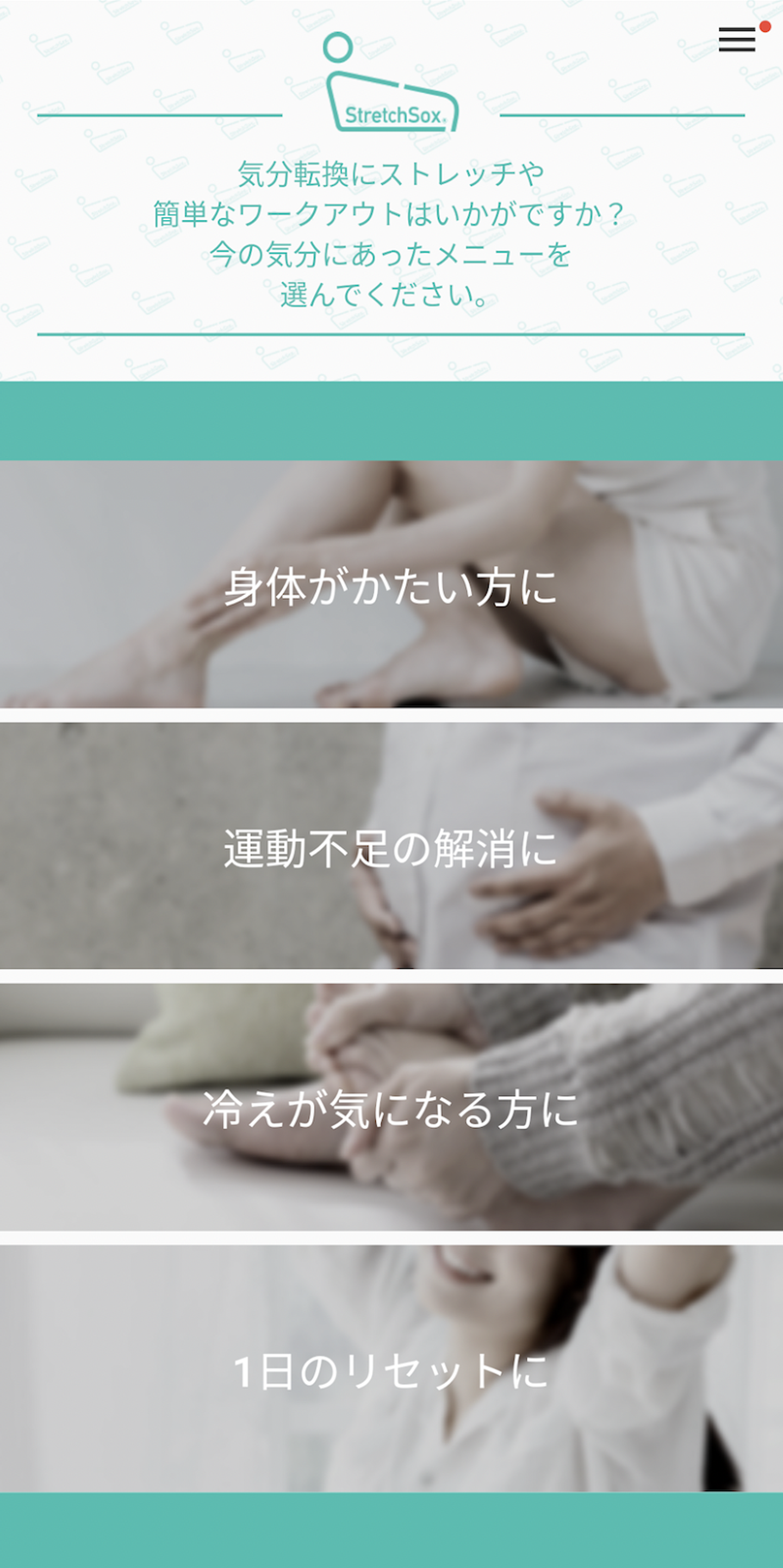主な機能としては、4つのカテゴリーから、今の自分の気分や体の調子にあうものを選択し、行うストレッチを選択できます。