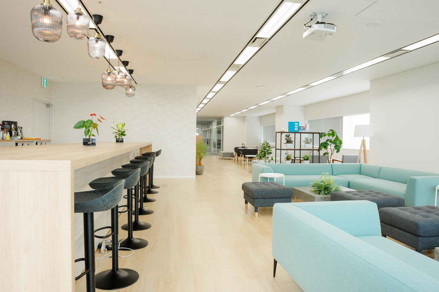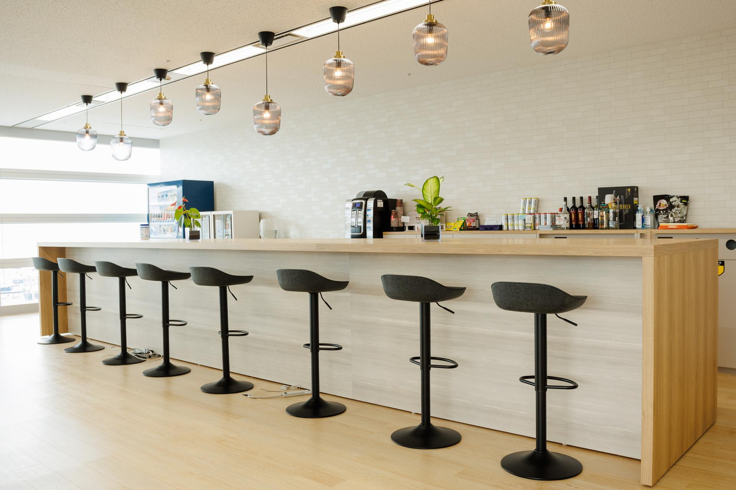 休憩やランチなどで使っていただけるロングカウンターやソファー等がおいてあり、コーヒーやウォーターサーバー、炭酸水、フリースナックなどを設置して、社員が自由に飲食できるようになっています。