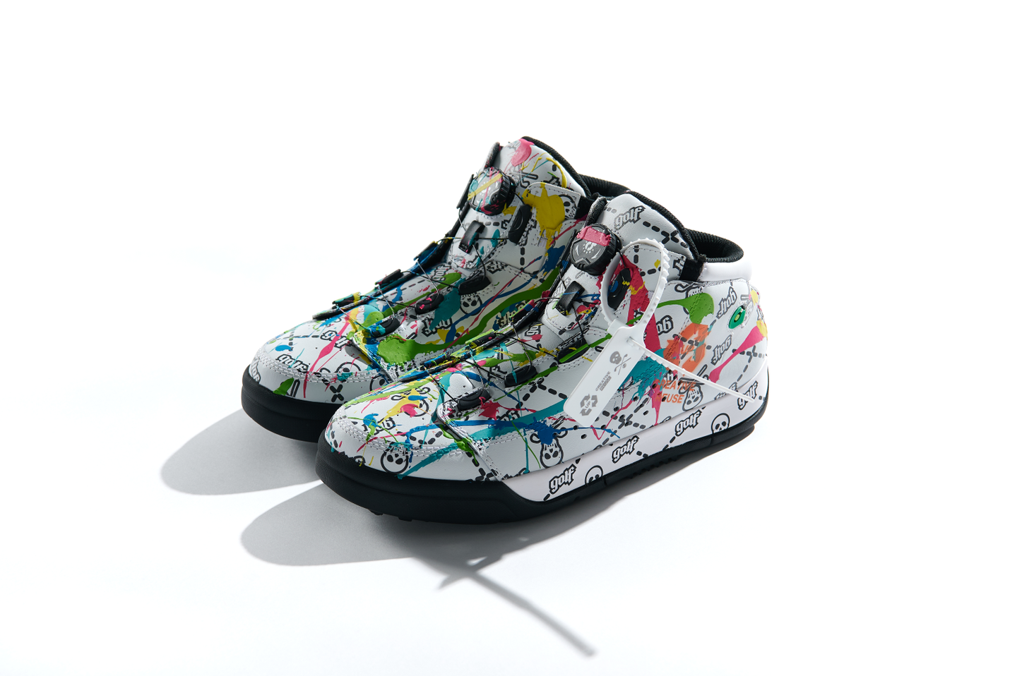 本体は上質なシンセティックレザーに「スカル×golfロゴ」のグラフィックをソール側面に至るまで全体にプリント。その上からアーティストによって一点ずつ異なるスプラッターペイントが施され、ABSTRACT限定のラゲッジタグが付属した世界に一足だけのアップサイクルなプロダクトです。