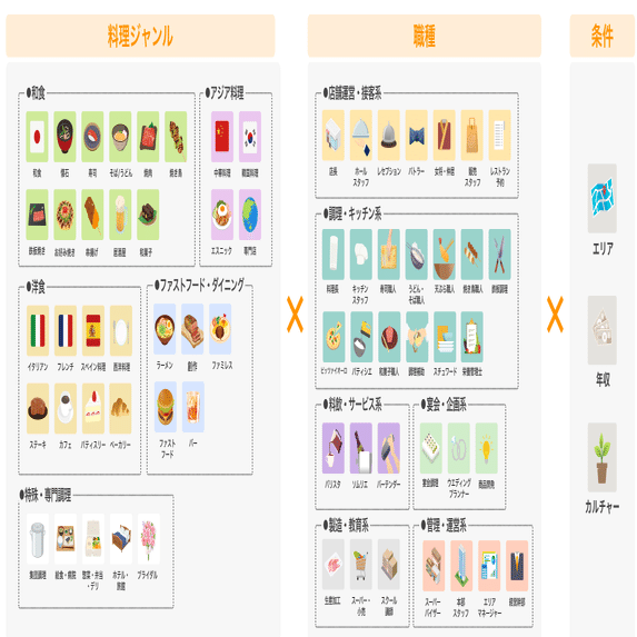 また、飲食人材と言っても、料理ジャンル×職種×条件面で考えると、ご経験や希望の掛け合わせパターンはものすごく多いんです。