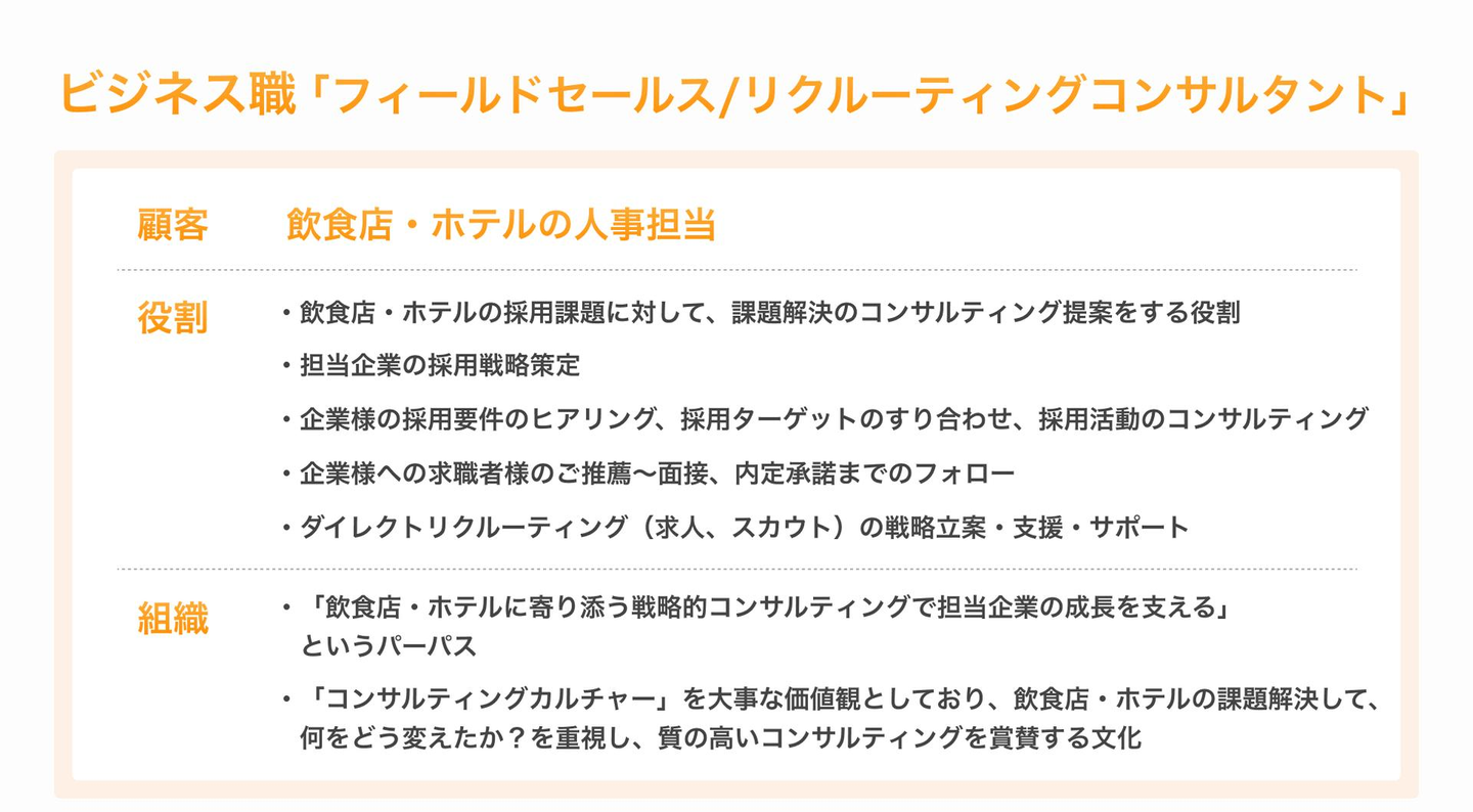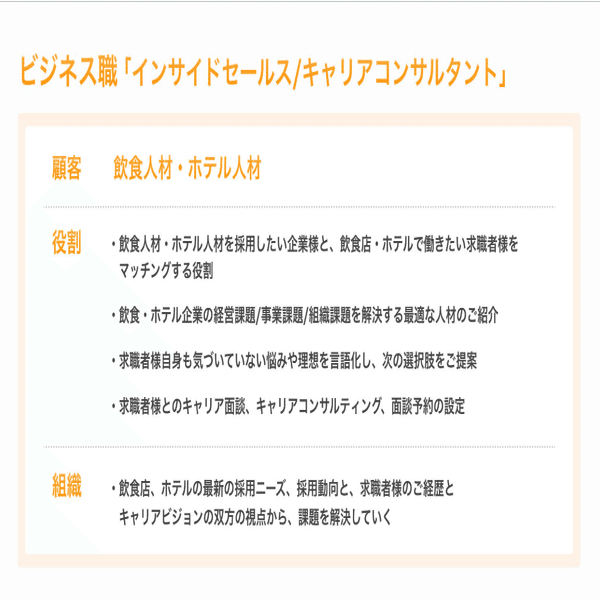 ですので、飲食人材、ホテル人材の両方のキャリアコンサルティングをできることは、インサイドセールス全員にとってものすごくプラスです。