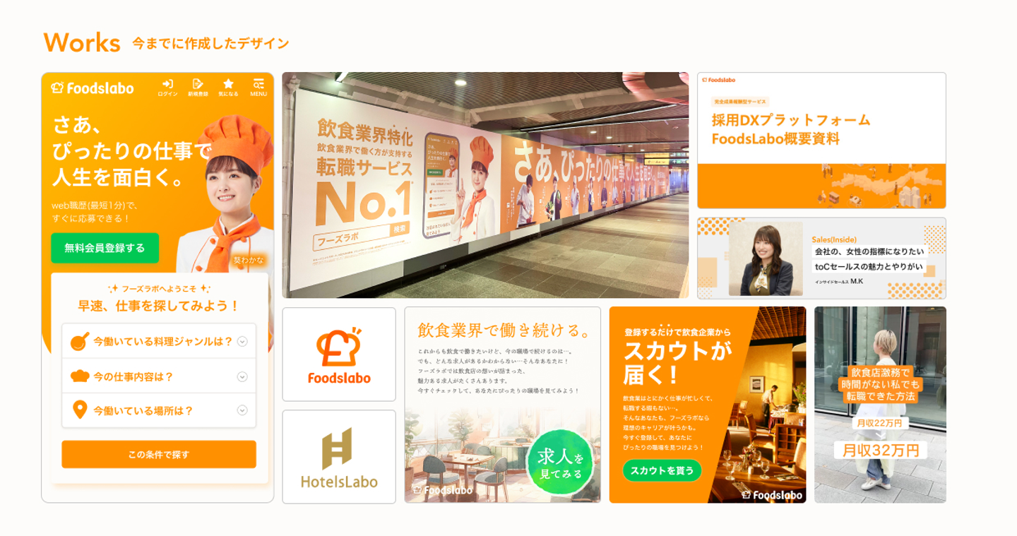 2021年クオレガに新卒入社し、飲食人材採用DXプラットフォーム「FoodsLabo」のリードデザイナーとして、マーケティング、プロダクト、ブランディング、デザインマネジメントを行う。新規事業「HotelsLabo」のリードデザインも行い、24卒含め7名のデザインGを管轄。