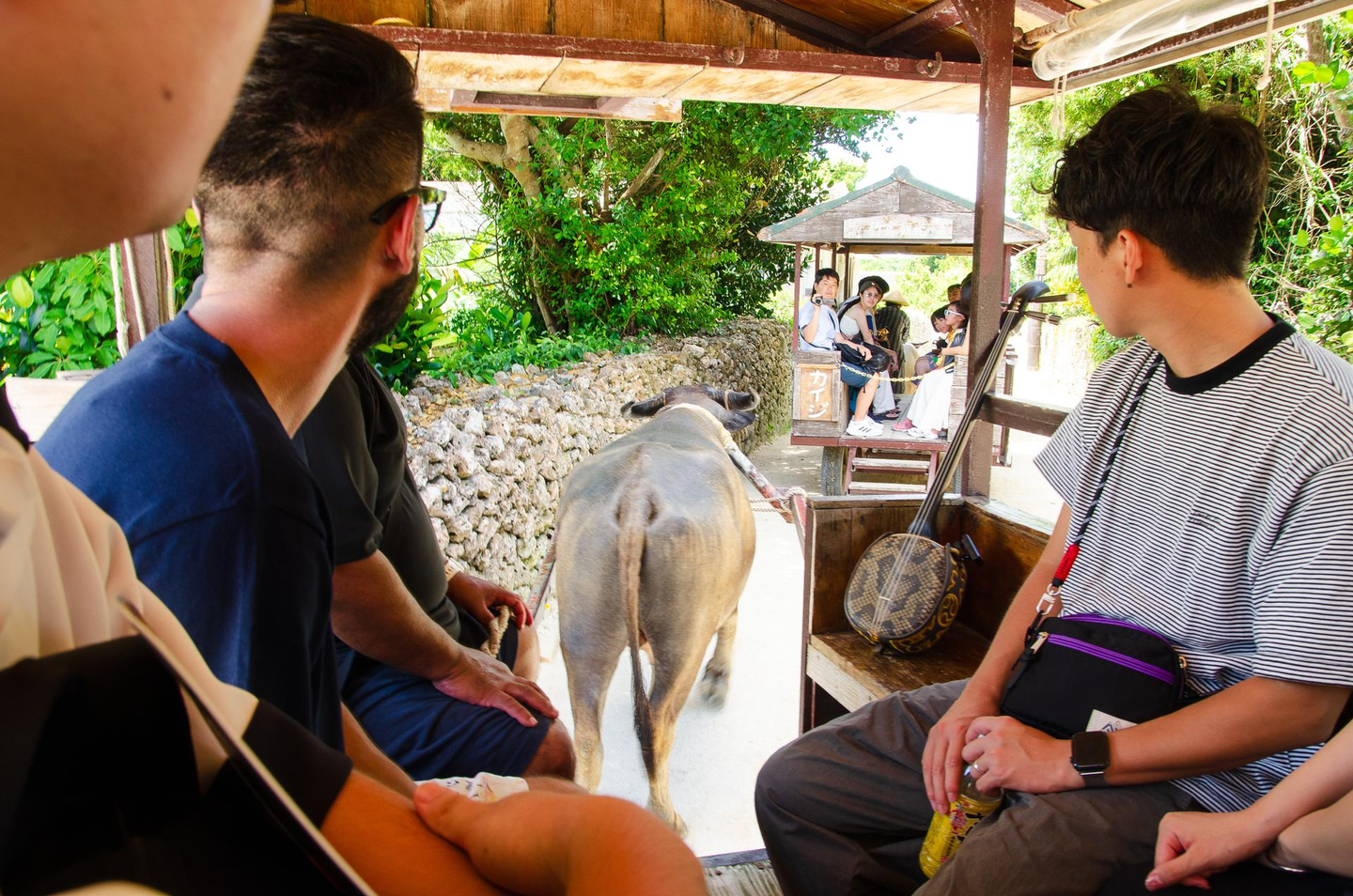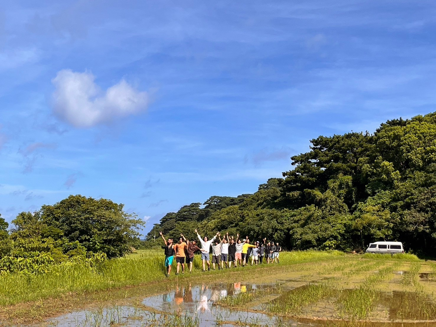 沖縄到着までの天気予報は台風直撃でしたが、日ごろの行いがよかったためか、晴天で綺麗な海を背景に集合写真が撮れました。沖縄到着後は自由行動で、「水牛に乗ったり」「カヤック」といった沖縄ならではのアクティビティを楽しみました!
