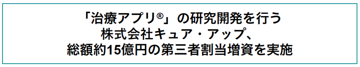 疾患治療用プログラム医療機器として「治療アプリ®︎」の研究開発を行う株式会社キュア・アップ(本社:東京都中央区 代表取締役社長:佐竹 晃太)はこの度、既存投資家であるBeyond Next Ventures、慶應イノベーション・イニシアティブに加え、新たに伊藤忠商事株式会社、伊藤忠テクノロジーベンチャーズ株式会社、CYBERDYNE株式会社、第一生命保険株式会社 、三菱UFJキャピタル株式会社、いわぎん事業創造キャピタル株式会社、株式会社セゾン・ベンチャーズ(株式会社クレディセゾンのコーポレートベンチャーキャピタル)、ちばぎんキャピタル株式会社、みずほキャピタル株式会社を引受先とする総額15億円の第三者割当増資を実施することをお知らせ致します。
