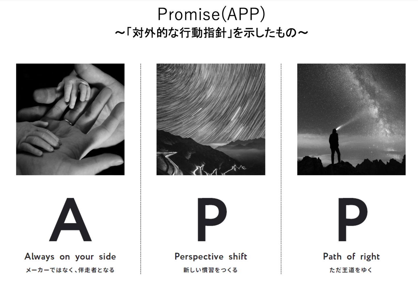 佐⽵:まず「Way」の⽅は、4年ほど前に会社のメンバーがまだ20名ほどのときに、3⽇かけて、皆で考えて決めました。⼤事にしたい⾏動指針の冒頭のアルファベットを集めると、社名のCUREになるんです。「Promise」は1年ほど前に、会社として世の中にリリースしていくものが⾒えつつある中で、お客様に対しての約束としての⾏動指針として考え、これがAPPになっています。