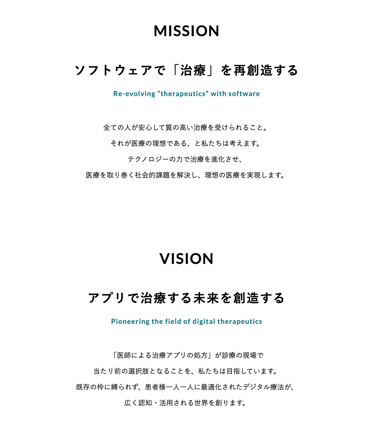 そのためにも、“アプリで治療する未来を創造する”というVision(ビジョン)をまずは医療現場において、実現したいと考えています。