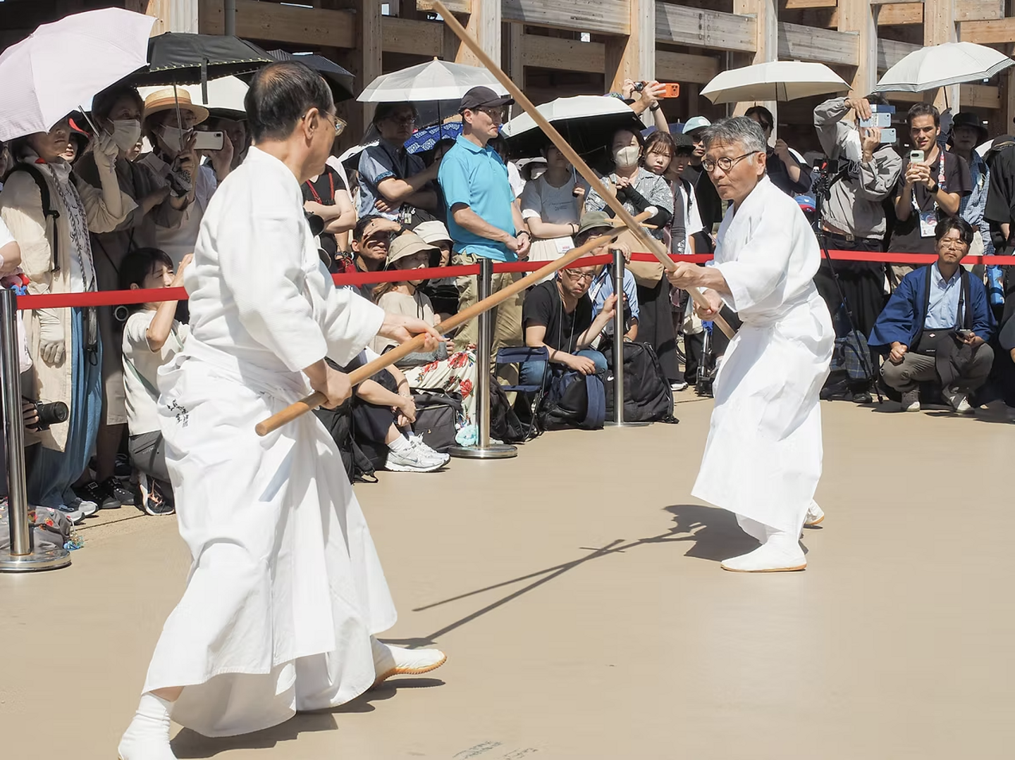 「体を捨てる」「待つことを捨てる」などの含意をもつ“タイ捨”の名が示すとおり、雑念を捨て自由な心で戦うことが理念にあります。大太刀の大きな弧と小太刀の素早い切り返しに、観客の視線が吸い寄せられました。