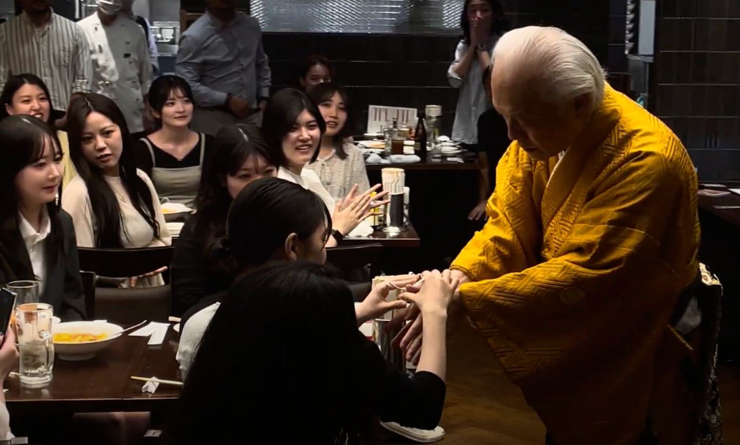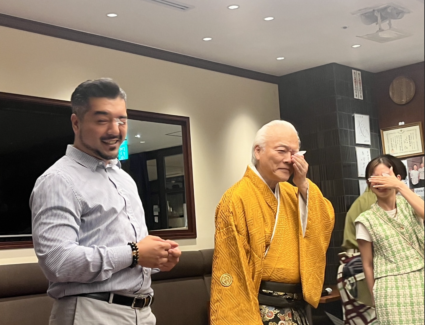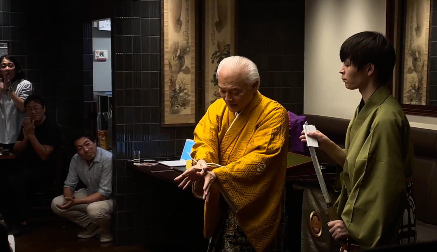 ワークショップでは、勇気あるお二人に実際に手妻を体験していただきました。名乗りを挙げたのは、お越しいただいたゲストの方と弊社アルムナイメンバー。「目の中に和紙を入れる」という芸にチャレンジしていただきました。