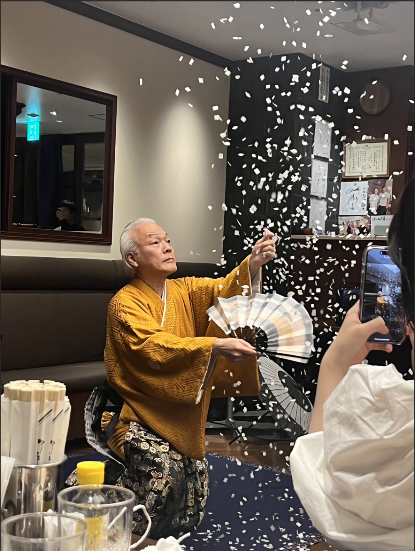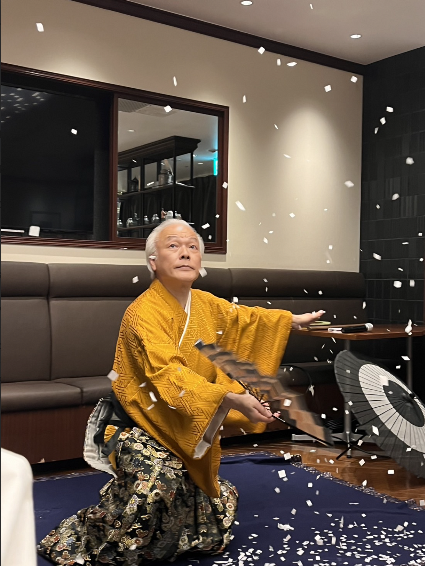 そして、トリを飾ったのは「蝶のたはむれ」という演目。紙を捻って蝶を作り、扇子で仰ぐと、ひらひらと飛んでいるように見えます。最初は一羽の蝶ですが、もう一羽加わって夫婦となり、最後は千羽の蝶が舞う様子を表した紙吹雪に変化しました。この「蝶のたはむれ」は、蝶の誕生、出会い、別れ、そして子孫を残すサイクルを描いています。これを「無常観」というそうで、一枚の紙で人生、無常を語る芸です。トリに相応しい美しく華やかな演技で、会場は歓声に包まれました。