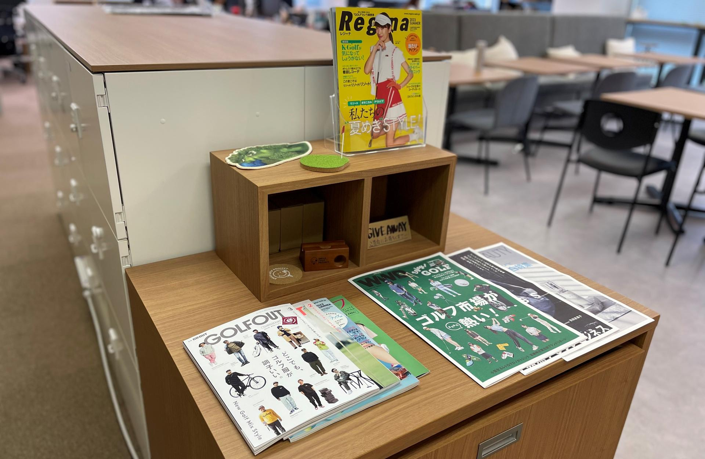 また日常の中で立ち止まるきっかけになるよう、ゴルフ雑誌や事業に関わる資料などを置いています。