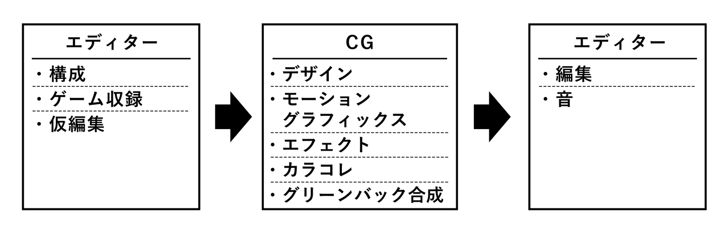 CyberBullでは、オフラインエディターとモーショングラフィックスデザイナーの役割分担はこの図のような形です。