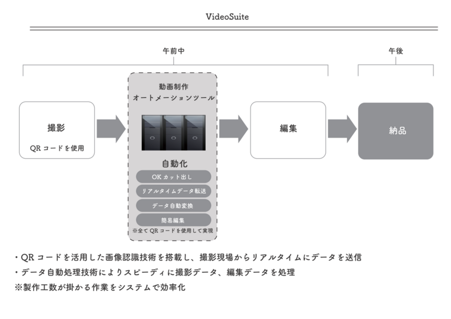 2つ目の課題であったファイル転送は、カメラにつながれたPCで、録画された動画素材がモバイル回線でも送りやすいサイズに自動エンコードされ、自社のサーバーに瞬時に送られるようにしたため、撮影終了と同時に編集作業を行うことが可能になりました。送られたファイルは、映像の中にある「QRコード」を読み取り、クライアント名、商材名や「どんな撮影」素材なのか、またOK素材、いらないNG素材なのかを瞬時にタグ付け(meta情報化)されます。その情報を見ながら動画編集者がOK素材だけを使い次々と編集を行っていきます。