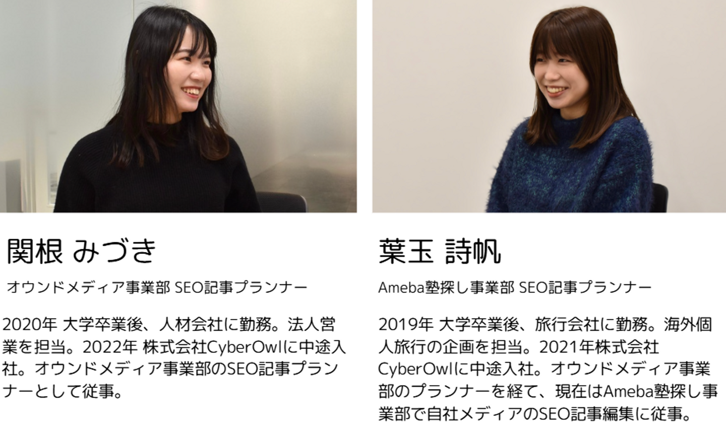 2023年初noteは、葉玉詩帆と関根みづきの対談をお届けします!以前までトレーナー(葉玉)とトレーニー(関根)関係だった2人に、サイバーアウルへの入社の決め手やお互いの第一印象、トレーナートレーニー時代のエピソードを聞きました。