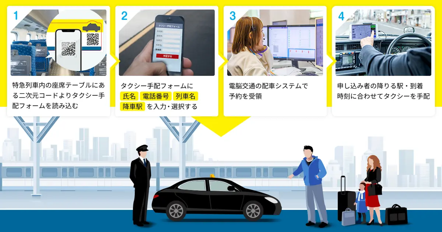 タクシー配車システムや配車業務の委託サービスを展開する株式会社電脳交通(本社:徳島県徳島市、代表取締役社長:近藤 洋祐、以下「電脳交通」)は、地方都市における公共交通の利便性向上を目指し、2024年12月1日より鉄道事業者向けに、列車内で降車後のタクシーを事前に手配できるサービスの提供を開始いたします。 本サービスにより、地方都市における鉄道などの一次交通からタクシーへのスムーズな乗り継ぎが可能になります。今後は、飛行機や船など他の一次交通との接続や多言語対応も検討しており、地域交通全体の課題解決に貢献してまいります。