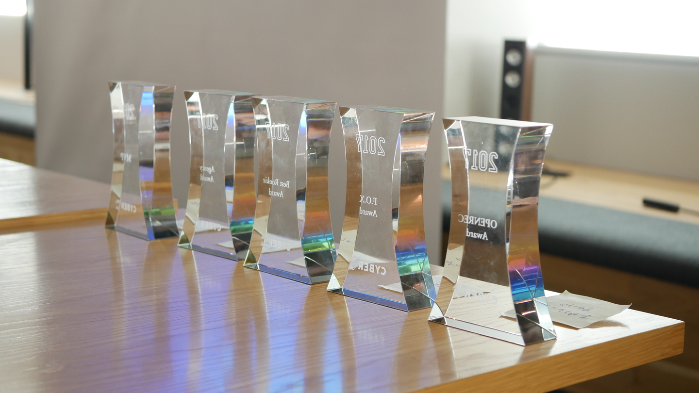 月に一度、CyberZ全社・各部署において、素晴らしい功績をあげた社員やプロジェクトに対して、全社表彰があります。受賞者には名前の彫られたトロフィーと、インセンティブ支給もあります。表彰は頑張った人を讃える場であると同時に、経営メッセージにもなっています。