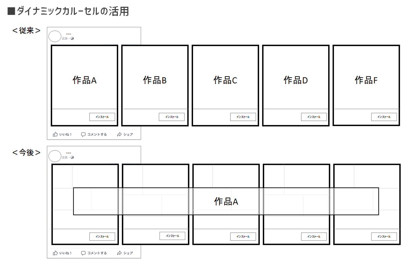 従来のダイナミック広告では、広告におけるマンガの表現方法が限られていたことに課題がありましたが、当社ではツールの開発、提供によりマンガ向けの「ダイナミックカルーセル」を実現しました。広告における表現の拡張と、ダイナミックの機能により「人」と「作品」のレコメンド精度が向上し、獲得効率の大幅な改善を期待できます。
