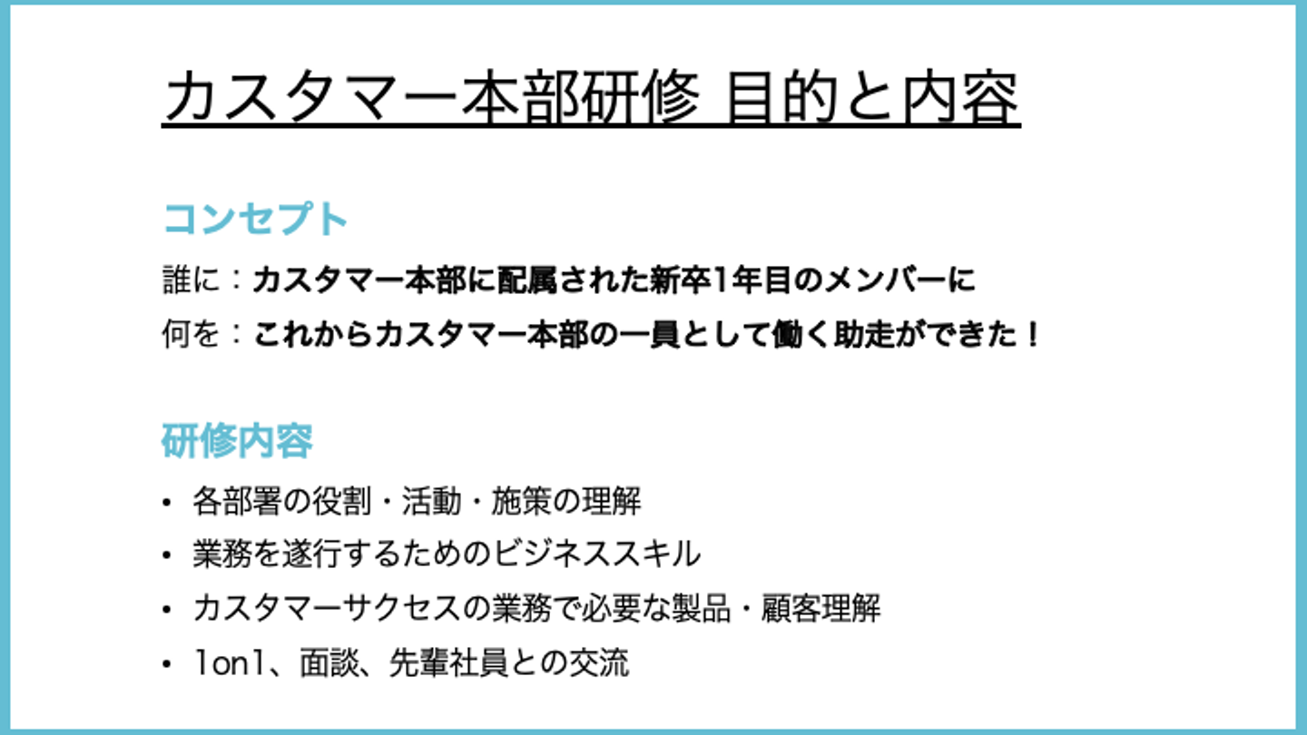 この記事では、カスタマー本部研修からカスタマーサクセス部配属後研修について、当時の私の体験を交えながら紹介します。