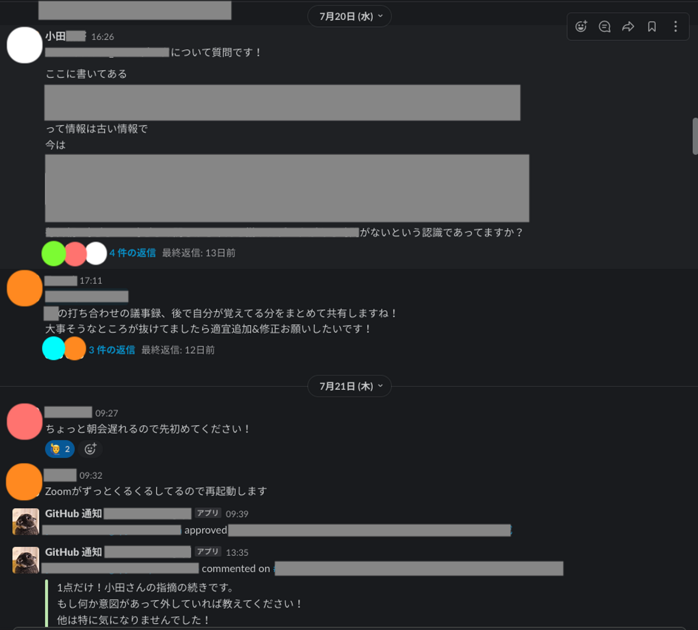 急ぎでチーム内に共有したいことがある場合には、Slack でコミュニケーションをとっています。