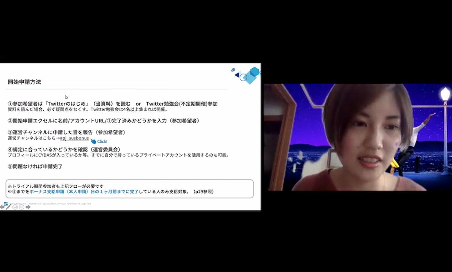 こちらはマーケ担当神田さんによる、ツイッターボーナス説明の様子。サイダスでは、会社の魅力を世の中にもっと知ってもらうべく「みんなでTwitterをはじめよう!」企画に取り組んでいます。