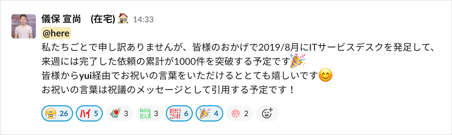 ただ、ITサービスデスクのタスクを1000件達成した時に、CTOから「頑張ってる人が見えるようにして、会社を盛り上げていこう!」って言われたんです。なので全社的に1000件達成したことを告知しました。