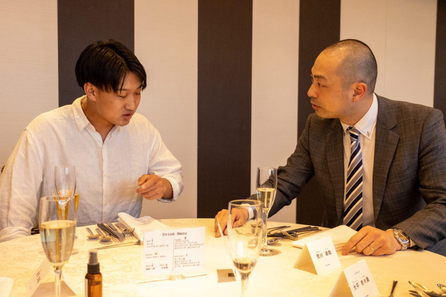 先輩後輩ごちゃ混ぜになってテーブルに座り、一緒にコース料理をいただきます。どのテーブルでも学生時代やお仕事の話などフラットな会話を楽しんでいました。