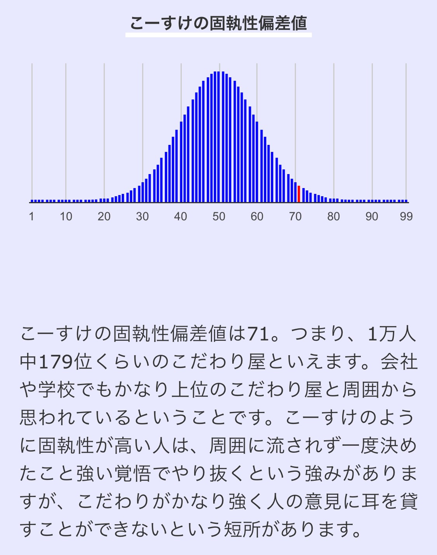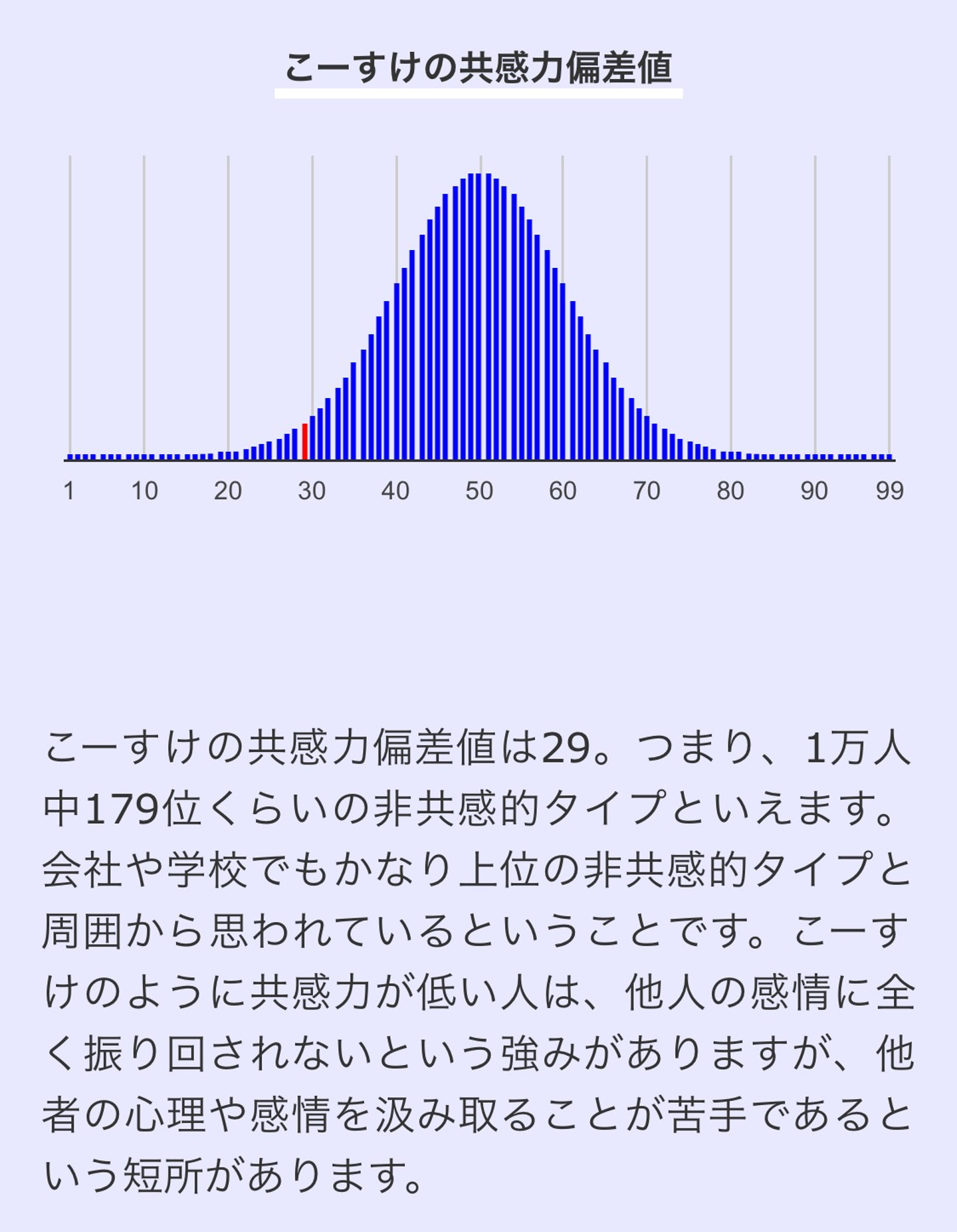 よく、こういう性格診断とかをすると、高いとか低いで一喜一憂する人がいる。それは、ちょっと違う。なぜなら、僕の共感性の偏差値が良い例だ。例えば、人の気持ちを理解できない。確かに、これは改善をしたい。ただ、他人の感情に左右されないというメリットがあるらしい(本当か?と思うが、そういうことにしよう)。
