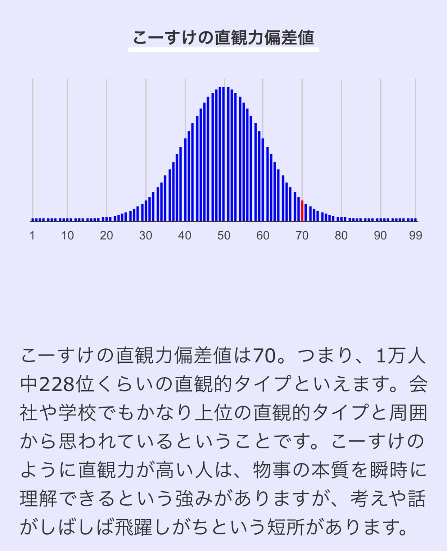 直感性偏差値は70だ。高いじゃん。物事の本質を直感的に見抜くらしいが、デメリットとして、話や論理が飛躍しがちになる。これは欠点であろう。例えば、講師をしている時、わかりやすく話すための論理ができていなかったら、人に物事は伝えられない。昔、ある人にその指摘を受けたことがある。