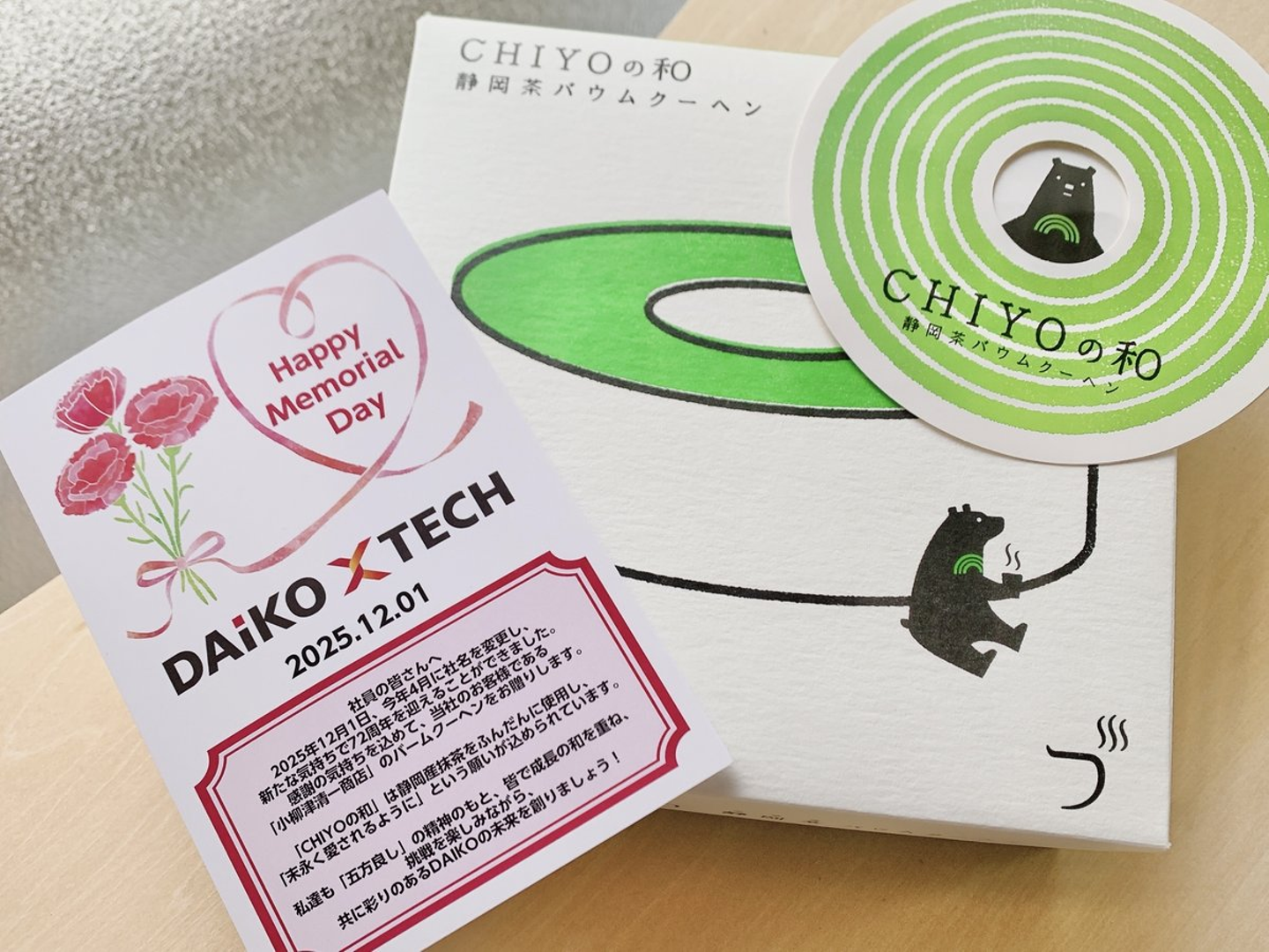 今年は静岡支店のお客さまである、小柳津清一商店様の、「抹茶バウムクーヘン CHIYOの和」が社員の自宅に送られました。