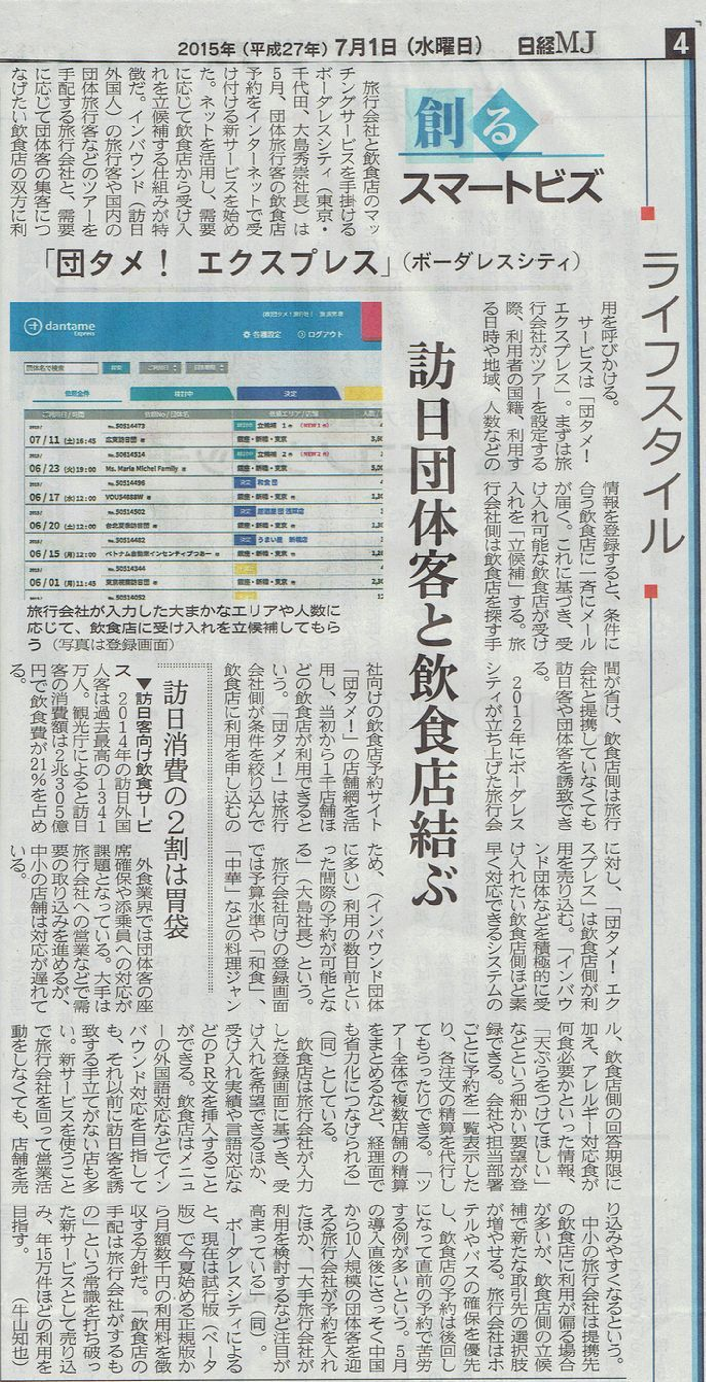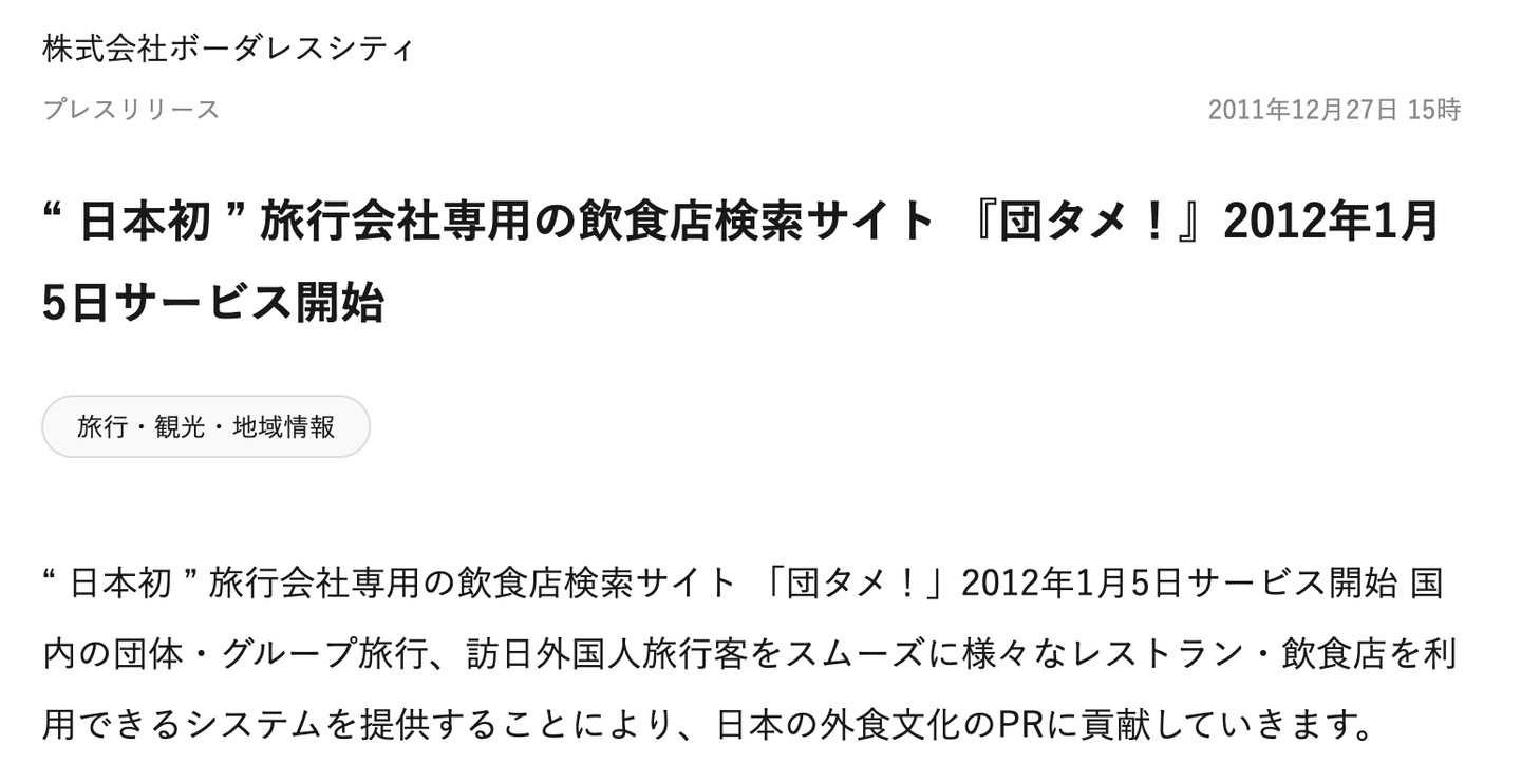 ボーダレスシティでは、旅行会社と日本の飲食店を繋ぐプラットフォーム「団タメ!」を運営しています。2011年の会社設立以降、現在では、JTB、HIS、近畿日本ツーリストをはじめ3,000社以上の旅行会社が利用、10,000店舗以上の飲食店が加盟、101カ国の取り扱い実績を有するサービスに成長しております。