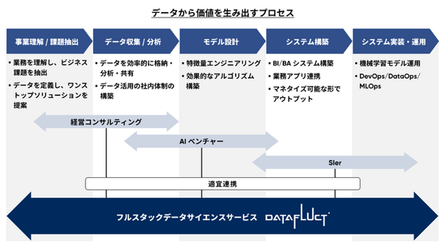 具体的には、マルチクラウド環境で最適なAutoMLモデルを構築できる機械学習プラットフォーム『DATAFLUCT cloud terminal.』をはじめとした、データサイエンティスト向けのサービス開発を強化します。データの収集から加工・処理・蓄積、特徴量エンジニアリング、モデル開発、MLOpsまでを一気通貫でカバーし、あらゆる企業や組織がデータを有効活用できる環境の提供を目指します。また、強化したプラットフォームを自社でも活用し、サービス開発・DX支援への相乗効果を生み出します。