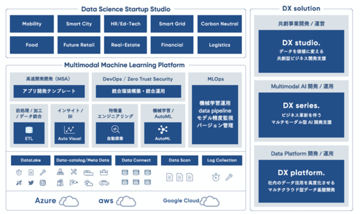 当社は、業界特化型のデータ活用サービスを開発する「データサイエンススタートアップスタジオ事業」、企業や組織のニーズを把握し、企業のデータ活用およびデータサイエンス事業開発を支援する「DXソリューション事業」、データ活用の環境をアップデートするサービスを揃えた「マルチモーダル機械学習プラットフォーム事業」を展開してまいりました。