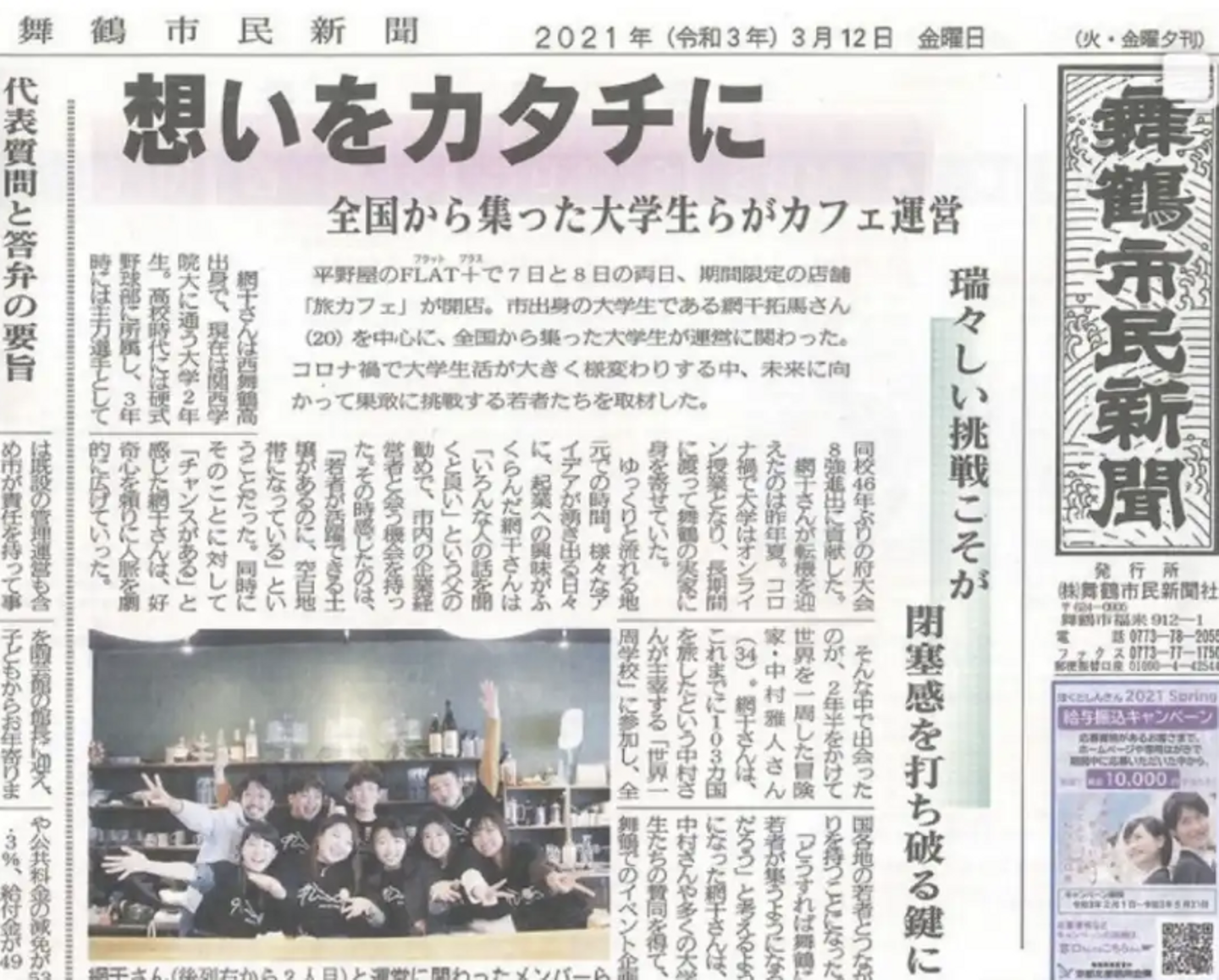 その後、イベントカフェの主催や学生団体の立ち上げなど、それなりの反響を呼び、それなりのお声はいただいた。(市民新聞や京都新聞に載る)