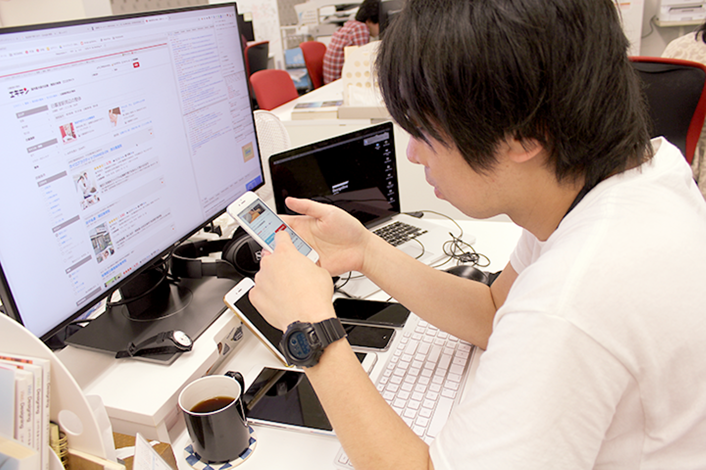 当社の主力サービスであるエキテンのユーザー層はとても幅広く、さまざまな方々に利用していただいています。パソコンやスマートフォンなど、さまざまな端末・環境でチェックし、問題ないことを確認します。