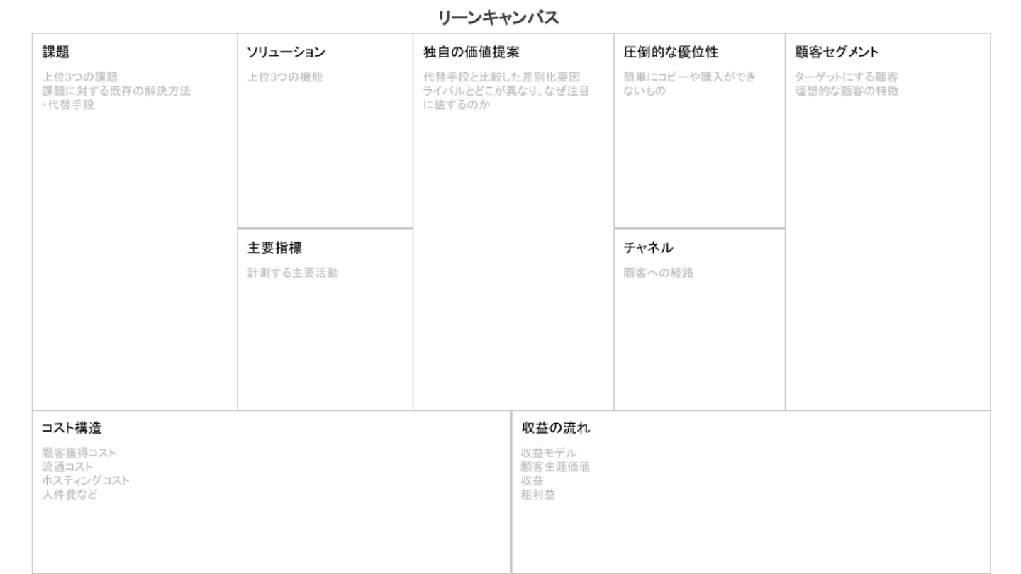 「リーンキャンバス」などはよく用いられるフレームワークですね。