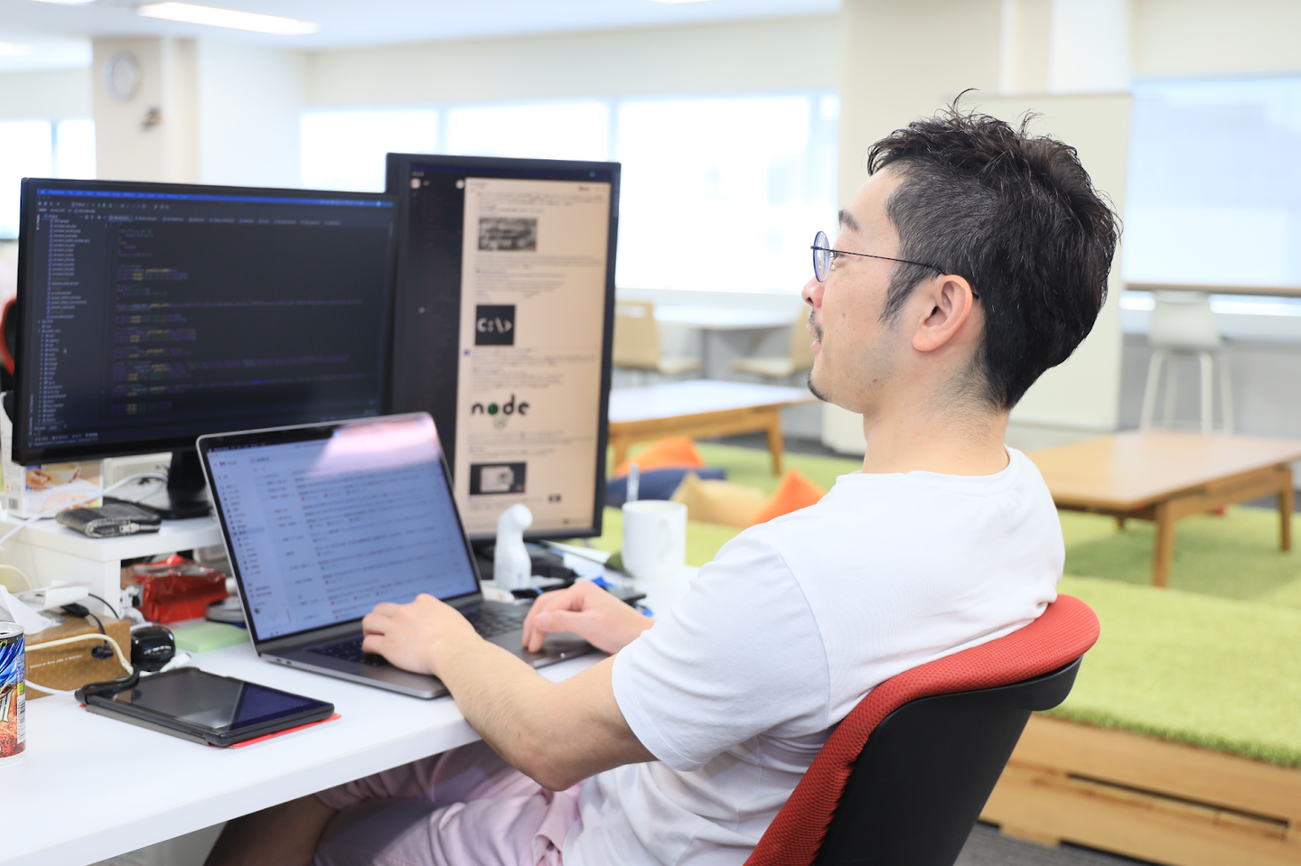 きっかけは、たまたま元同僚の加藤さんがSNSで求人募集をしていたので、話を聞いてみることにしたんです。正直、それまでデザインワン・ジャパンという会社もエキテンというサービスも知らなかった。加藤さんと話をした後、会社のミートアップに参加したり、カジュアル面談したりとメンバーとも会う機会を何度かもって、メンバーとの相性も良さそうだったので、選考を受けることに。入社の理由は、働き方が自分のライフスタイルに合うことは勿論大事にしたい条件でした。エンジニアとしては、エキテンというサービスに直せるところがいっぱいあったので。笑 私は、新規開発よりも既存改修の方が好きなんですね。それぞれ、魅力ややりがいがありますが、個人的には、既存改修はすぐ結果が出る。そっちの方が楽しい。って思うんです。あとは、会社としても組織としても、これまで私が経験した会社に比べて規模も小さいので、まだ整っていない所があるんだろうなとは思ったので、これまでの経験で学んだことを仕組み等にも活かしていければ良いかなと思い、入社を決めました。