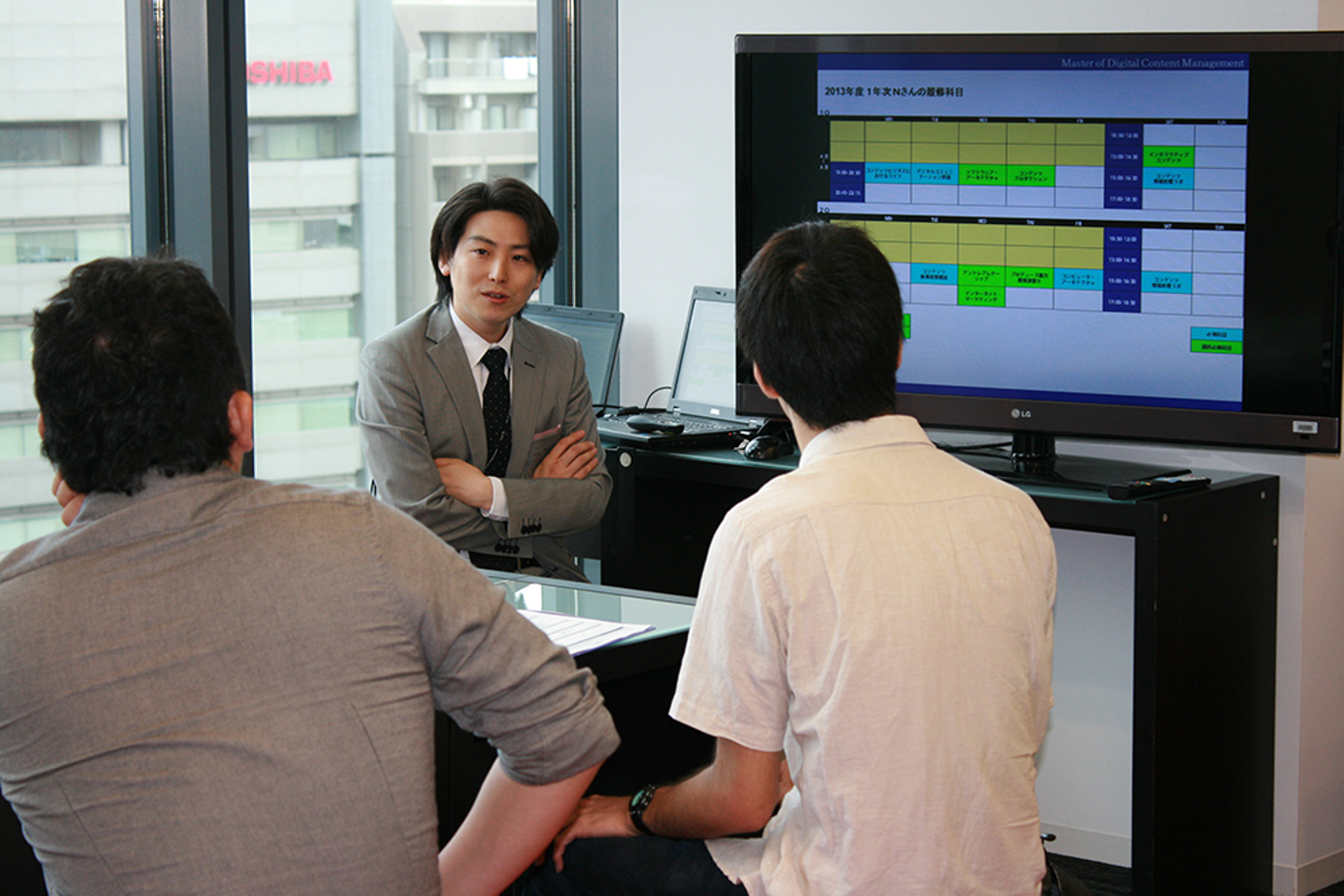 その後、人材育成コンサルティングと法人営業のマネージャーを担当し、現在では大学事業部の副部長として、「デジタルハリウッド大学大学院」の事務局長などを務めています。仕事内容としては、専門職大学院と産学官連携センターという、デジタルハリウッド大学の中の2つの組織の統括をしています。具体的には、院生の募集、カリキュラム開発、学事の企画・運営、研究推進、法人営業などのリーダーを担当しています。