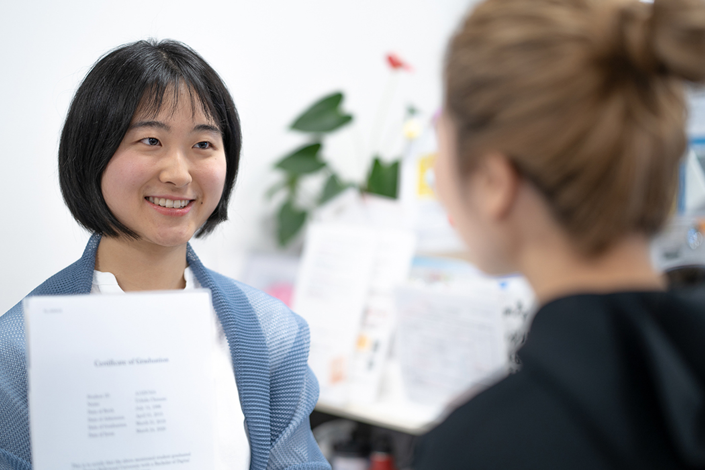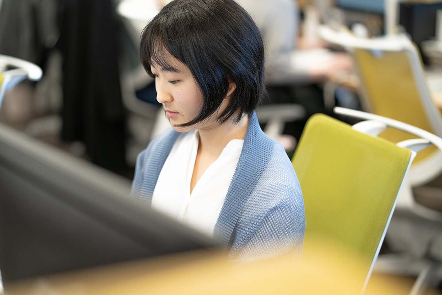 また学生支援グループでは、これまでのシステムや業務内容のブラッシュアップが、スタッフ同士で行われる場面もよくあり、常に進化し続けていると感じます。最近では、提出された卒業制作課題のデータ化や学生・教職員が利用する新システムの導入などが行われました。私は卒業制作課題のデータ化を担当しましたが、詳細な運用法を決めるところから始まって、教員・学生に説明する為の資料作りやデータの取りまとめまでを上司に助言をいただきながらやり遂げました。入社一年目から様々なことに挑戦させていただけるので主体性も磨かれますし、ひとつひとつ皆でつくって運営しているという実感が得られるので、やりがいを持って働ける職場だと思います。