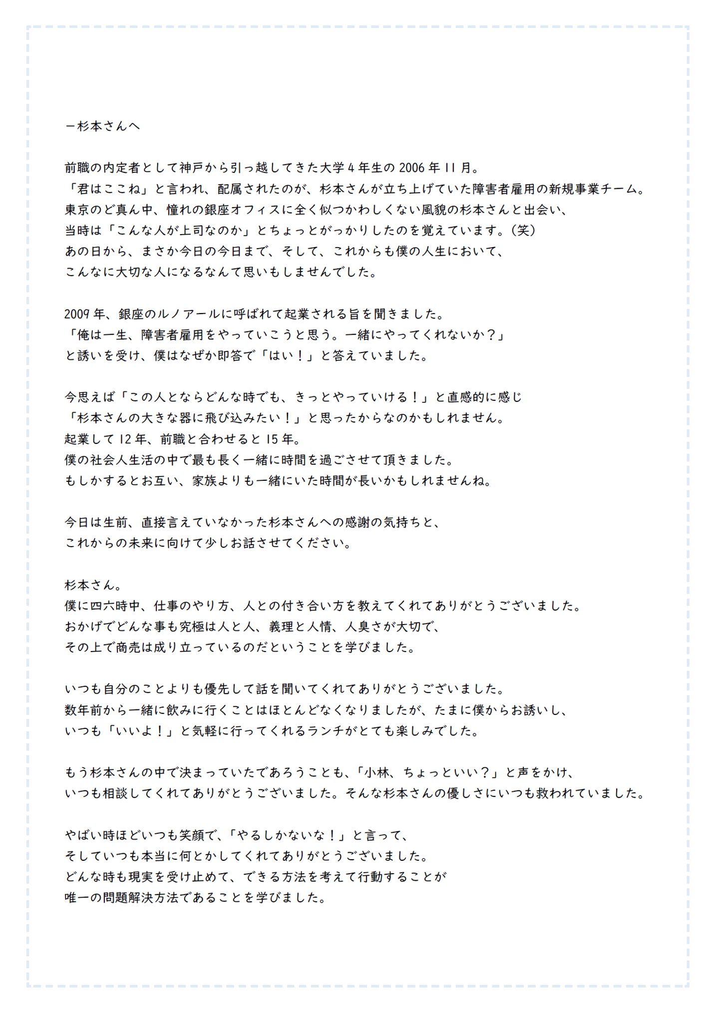 特にご遺族にとっては仕事が最優先の杉本さんでしたから、一緒に過ごす時間が少なかったのではないかと思います。だからこそD&Iでの杉本さんについてたくさん知ってもらいたいと思いました。