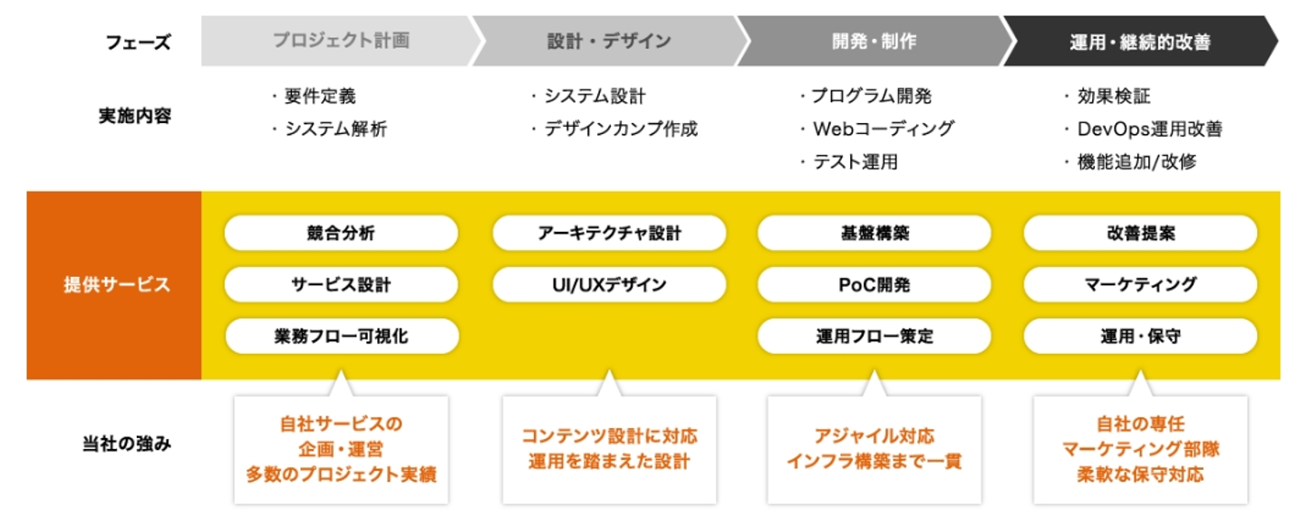 要件定義、設計、プログラミング、テスト、運用、品質管理の各工程に対応しております。