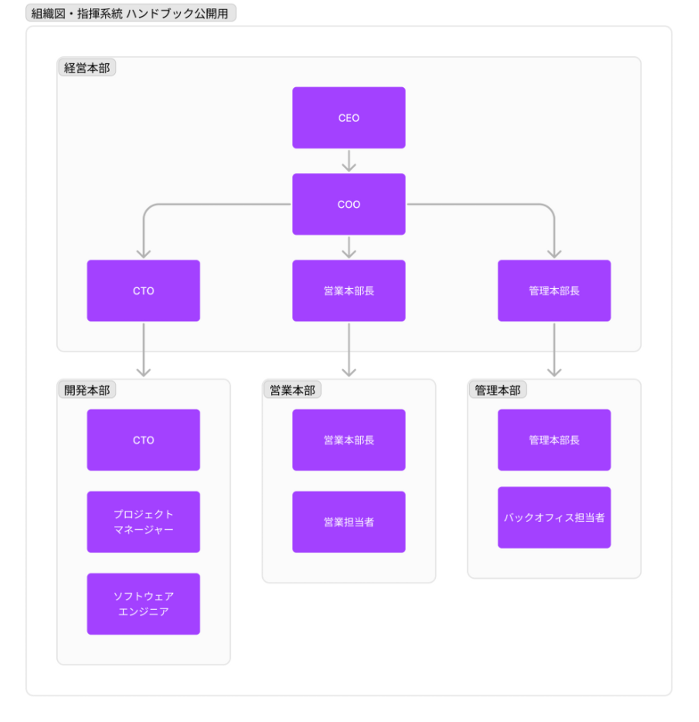 Digeonでは、経営本部・開発本部・営業本部・管理本部の4つの部署を設置しています。組織の配置としては、下図のようになります。