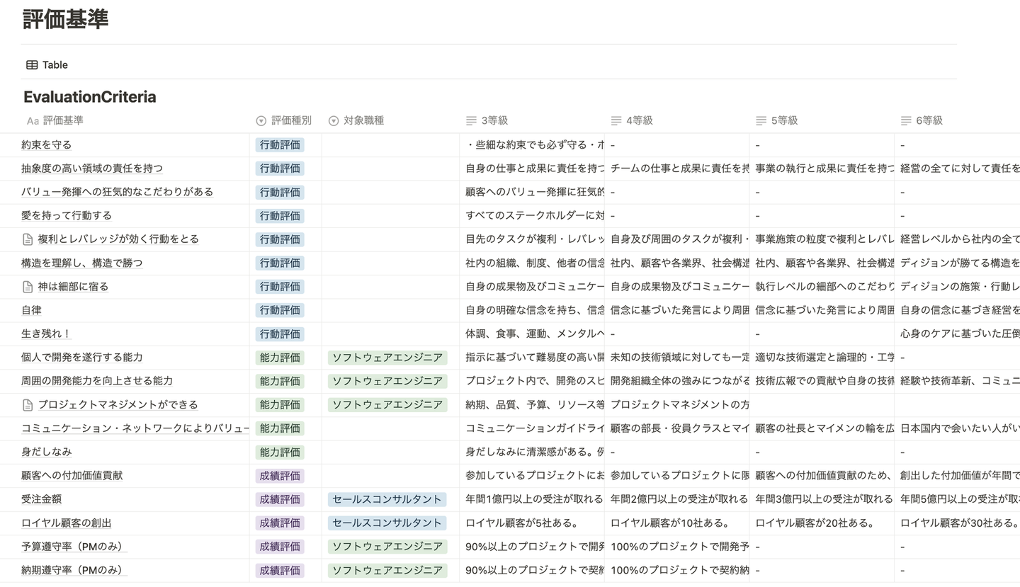 評価基準は、価値観の「会社は個人の全体最適への行動が、評価の最大化になるよう設計する」をもとに定めており、等級は関わる業務の影響範囲が基準となっています。仕事は個人の能力に応じて与えられ、その結果で評価されます。